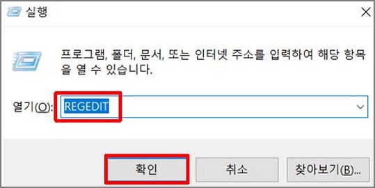 1) Win + R 키을 누르거나 검색하여 실행앱을 실행한 후 REGEDIT를 입력하여 확인을 누릅니다.