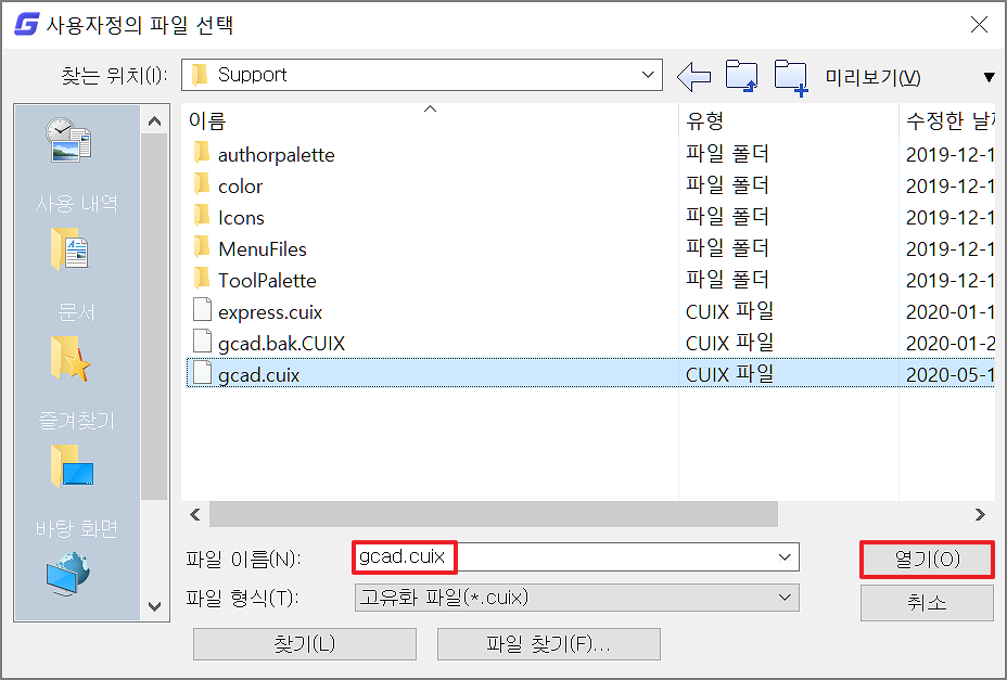 3) 사용자정의 파일 선택 창에서 gcad.cuix를 선택하고 Open버튼을 눌러줍니다