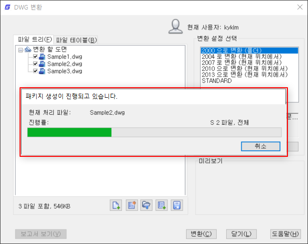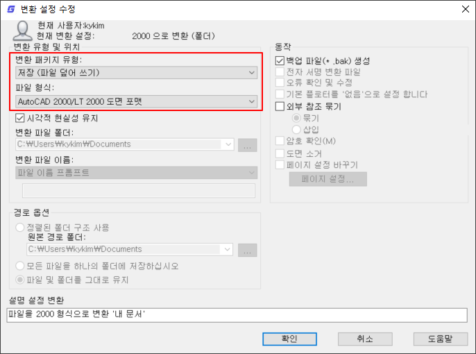 6. 2000으로 변환을 선택한 후 [변환]을 클릭하면 도면의 버전이 바뀌어 저장됩니다.