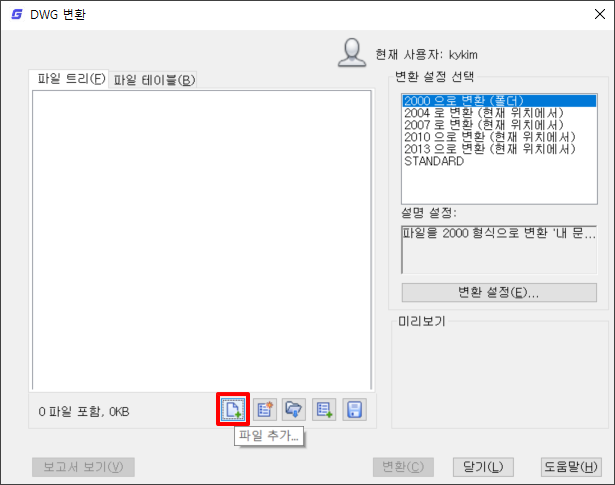 2. 기능을 실행하면 [DWG 변환] 대화상자가 표시됩니다. 하단의 파일 추가 버튼을 클릭하여 변환할 파일을 모두 선택하고 열기 버튼을 누릅니다.