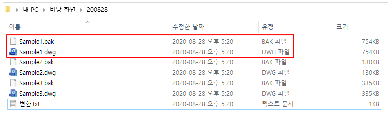 7. 도면이 위치한 폴더를 확인하면 원본파일은 백업파일인 bak 파일로 변경되고, 2000 버전으로 변환된 파일이 생성된 것을 확인할 수 있습니다. txt 파일은 변환 보고서입니다.