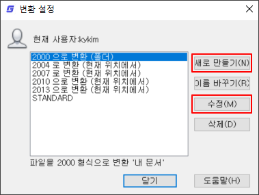 4. 설정을 변경하기 위해서는 [변환 설정]을 클릭한 후 [새로 만들기] 또는 [수정]을 누릅니다.