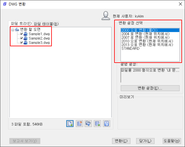 3. 파일 트리에 선택한 도면이 모두 추가되며, dwg 버전별로 구성되어 있는 변환 설정 선택에서 원하는 설정을 선택합니다.