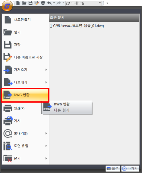 1. 왼쪽 상단의 G 아이콘을 클릭하여 DWG 변환을 클릭하거나 명령어 DWGCONVERT를 입력합니다. 이때 해당 도면은 열려있지 않아야 합니다.