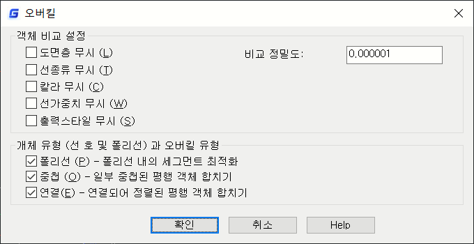 중복 객체 삭제(OVERKILL)는 중복되거나 겹치는 선, 호 및 폴리선을 제거하고 부분적으로 겹치거나 연속되는 항목을 결합하는 기능입니다. 여러 선이 겹쳐 있을 때, 하나의 긴 선으로 합쳐 도면의 불필요한 객체를 지울 수 있습니다.