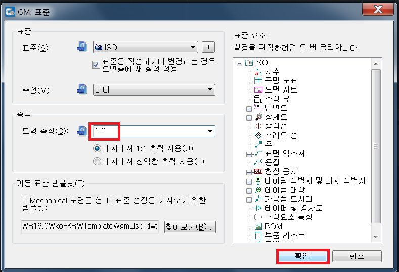 2. 모형 축척에서 원하는 스케일 값을 기입한 후 확인 버튼을 클릭합니다.