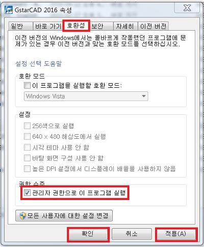 2. 호환성 탭에서 권한 수준의 ‘관리자 권한으로 이 프로그램 실행’에 체크한 후 적용, 확인 버튼을 차례로 누릅니다.