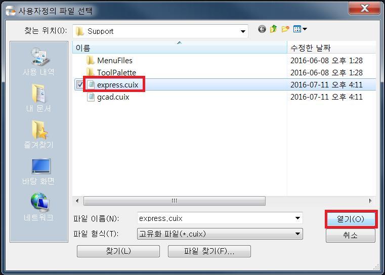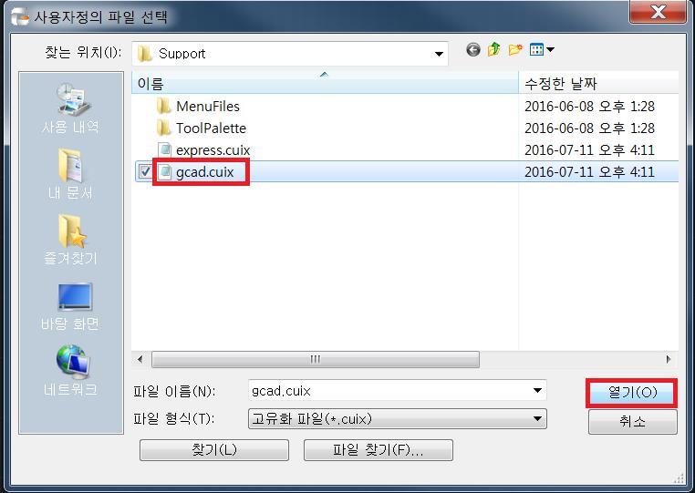 6.gcad.cuix를 선택한 후에 열기 버튼을 클릭합니다
