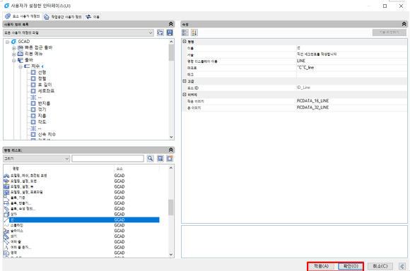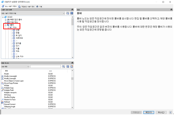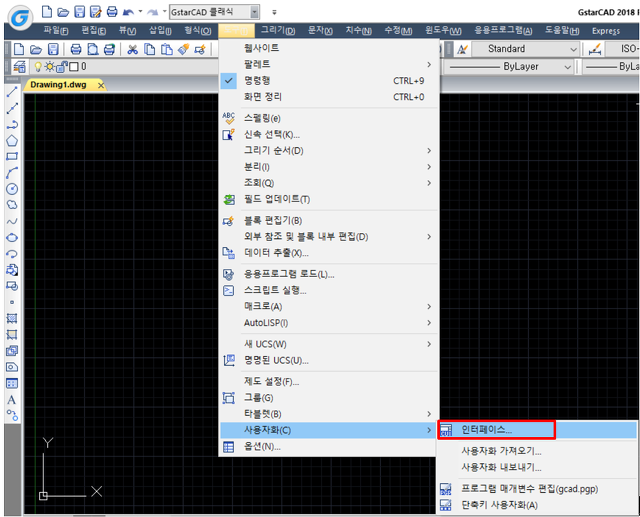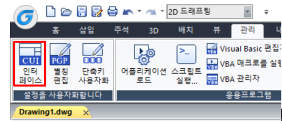 작업 공간이 GstarCAD 클래식 일 경우 : 도구 > 사용자화 > 인터페이스
