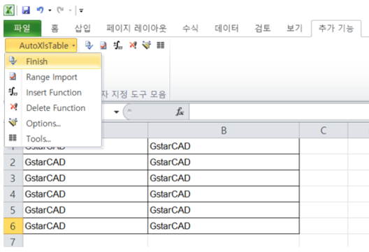 4. 상단의 메뉴의 추가 기능에서 AutoXlsTable 하위의 Finish를 눌러줍니다.