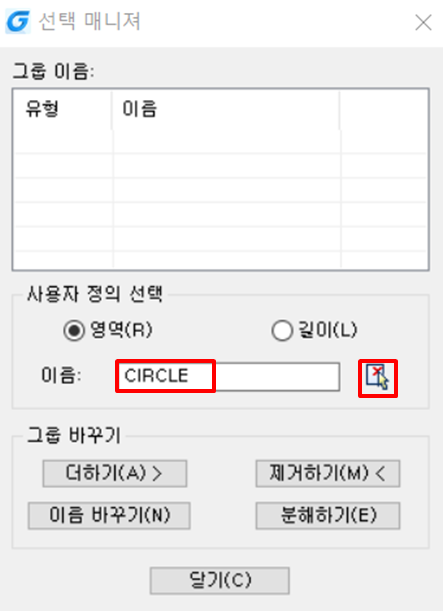 그 후 이름 칸에 CIRCLE를 적고 옆의 객체 선택하는 마우스 모양을 선택합니다.