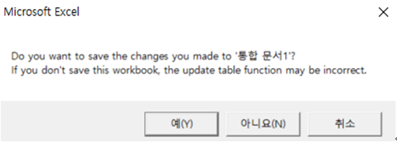 (이 문서를 저장하지 않으면 테이블을 업데이트하는 기능이 잘못될 수 있다는 안내입니다.)