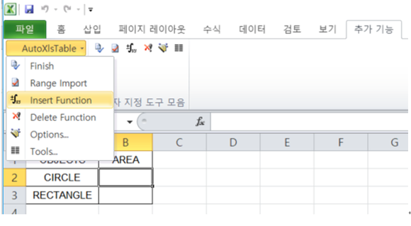 추가 기능 메뉴에서 AutoXlsTable 아래의 Insert Function 을 눌러줍니다.