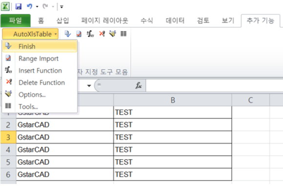 3. 작업이 완료하면 상단의 메뉴의 추가 기능에서 AutoXlsTable 하위의 Finish를 눌러줍니다.