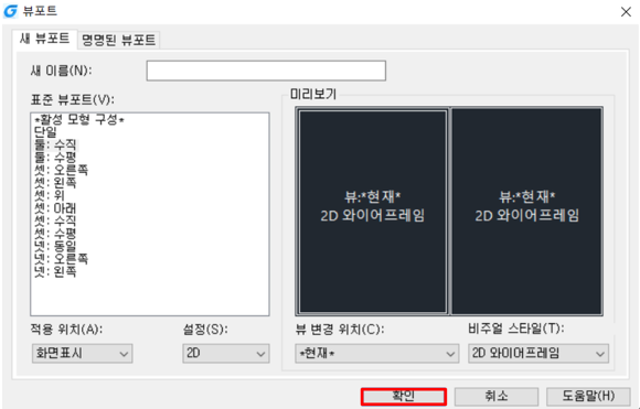 2. 아래의 창이 표시되면 원하는 뷰포트와 스타일 등의 설정값을 선택한 후 확인을 눌러줍니다.