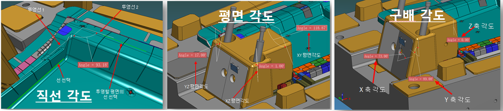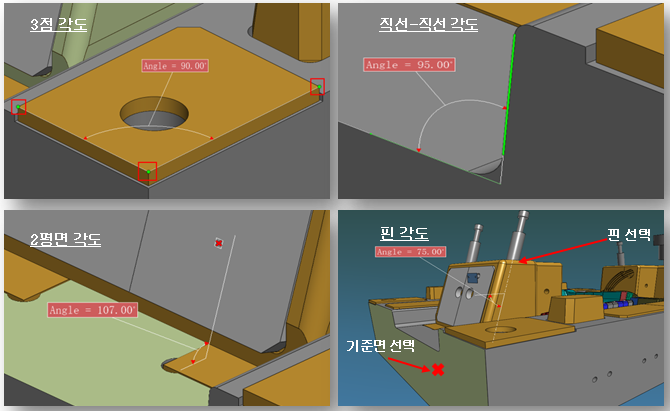 선택된 3점이나 두 면, 두 선 사이의 각도를 측정하거나 선택한 핀과 면 사이의 각도를 측정합니다.