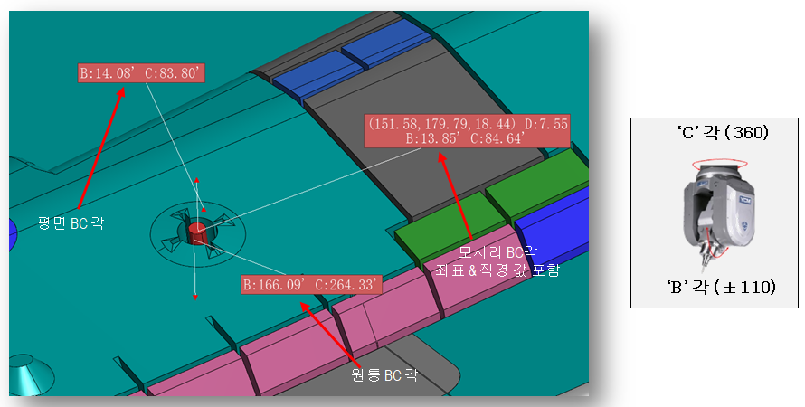 선택된 평면, 홀 모서리와 원통에 대한 가공 도구의 스핀들 회전각(B)과 공구 진입각(C)을 측정합니다.