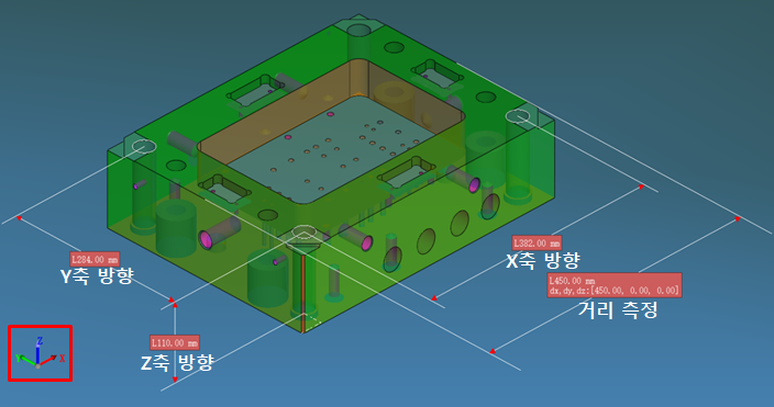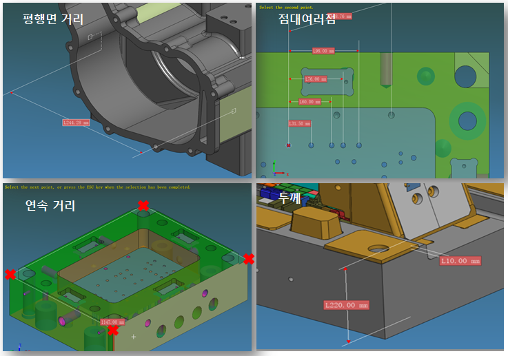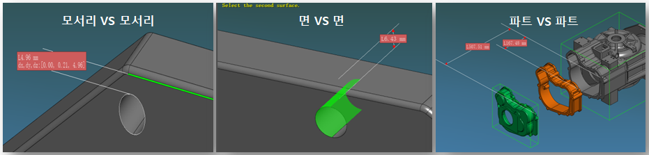 3D FastView에서는 다양한 방법의 거리 측정 기능을 제공하여 최대/최단거리, 축 방향 거리 등을 쉽게 측정할 수 있습니다.