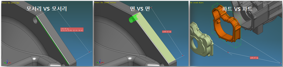 두 모서리, 면, 파트 간의 최대거리와 최단거리를 측정합니다. 측정 시 개체 선택을 위하여 알맞은 개체 스냅이 활성화되어 있어야 합니다.