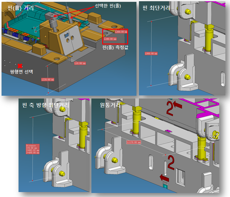 선택한 핀(홀)과 평행인 면의 거리나 두 핀(홀) 사이의 중심선 기준 거리, 기준 축 방향 거리 등을 측정합니다.
