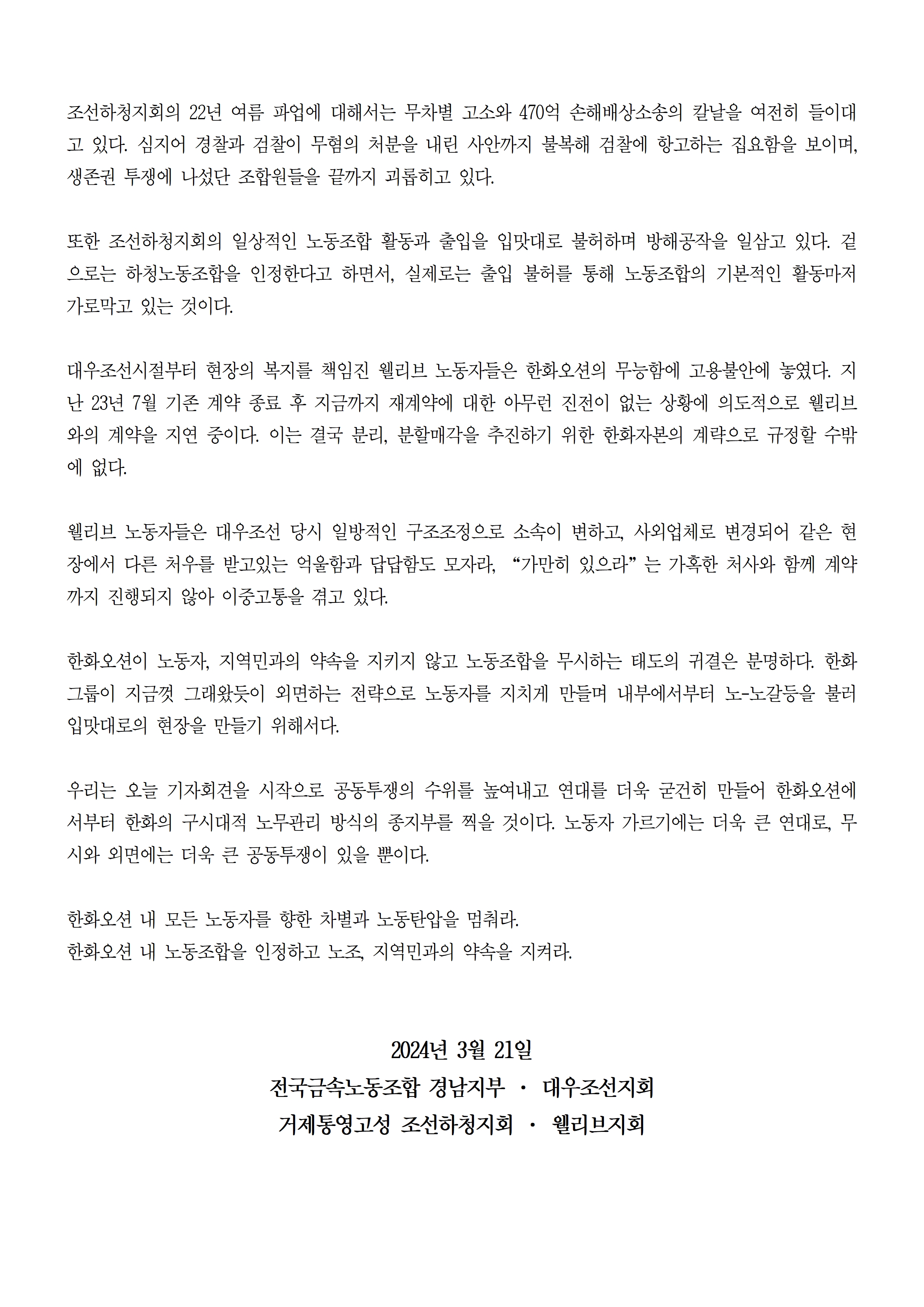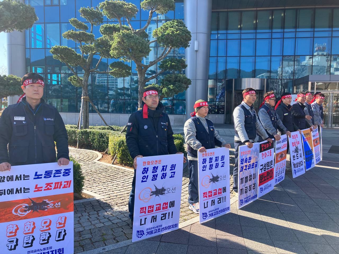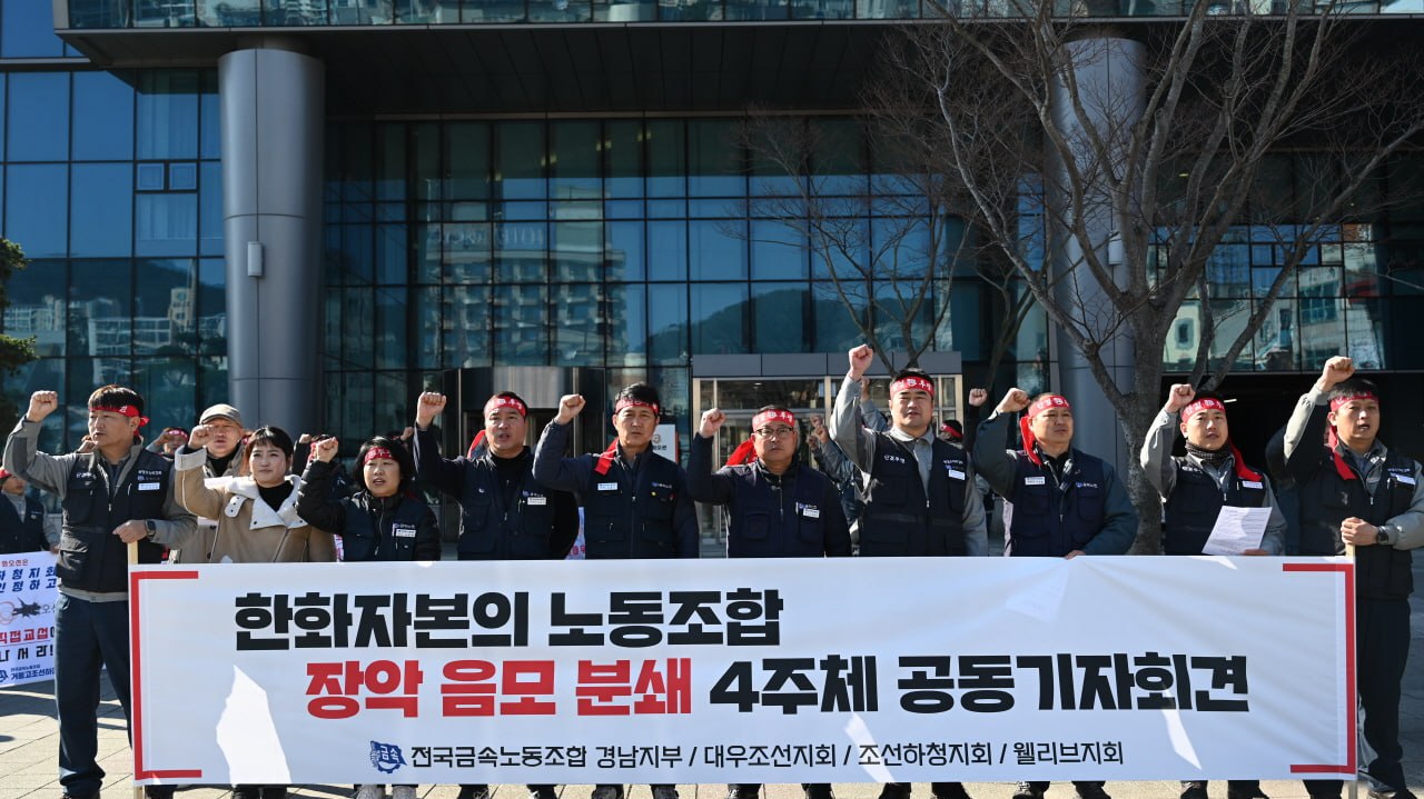 이에 금속노조 경남지부, 조선하청지회, 웰리브지회, 대우조선지회는 해피니스홀 앞에서 한화오션의 노조탄압을 규탄하는 공동 기자회견을 했습니다.