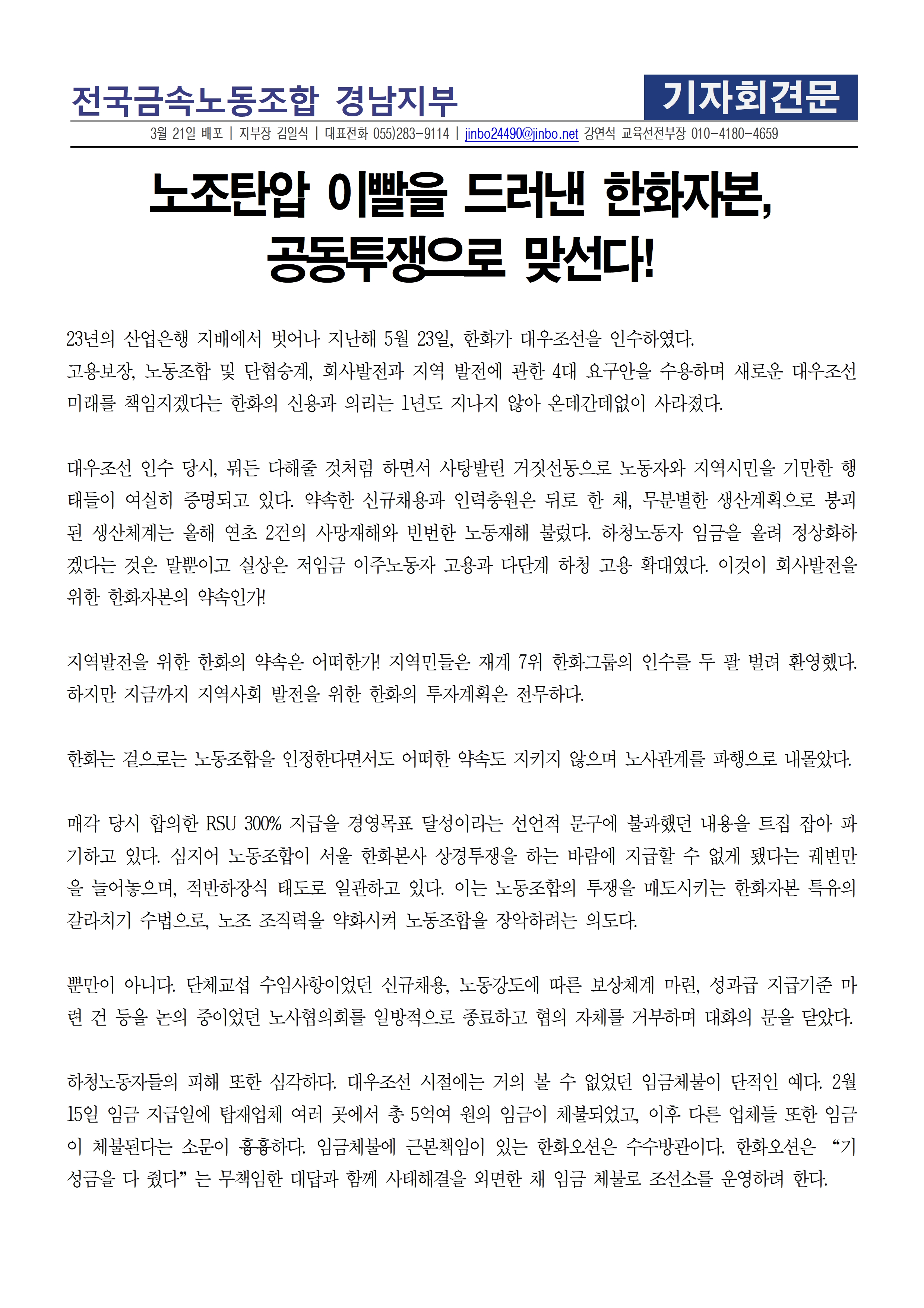또한, 주주총회장에 들어가서 성과금 지급 합의를 지키라고 한화오션 권혁웅 대표이사에게 촉구했습니다.