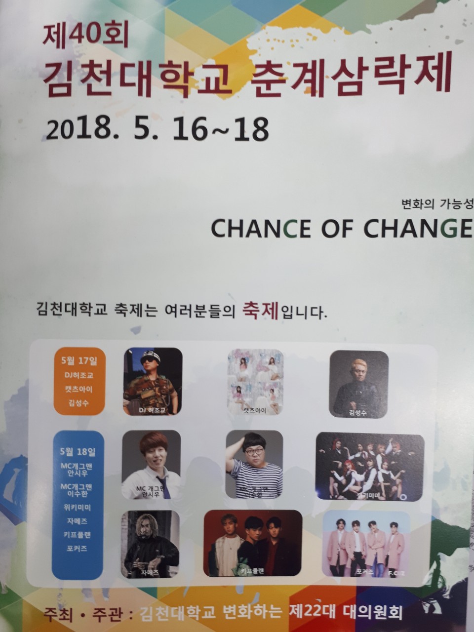 김천대 축제를 시작합니다 작성자김천대학교|작성시간18.05.16|조회수31 목록 댓글 0 글자크기 작게가 글자크기 크게가 김천대학교 춘계삼락제(축제)는 2018. 5. 16~18까지 이며,주간에는 체육대회가 있으며, 야간에는 학생들의 장기자랑과 가수 초대로 이루어지며주막촌도 같이 진행 됩니다. 많은 관심 부탁드립니다. 다음검색 현재 게시글 추가 기능 열기 북마크 공유하기 신고 센터로 신고 댓글 댓글 0 댓글쓰기 댓글 리스트
