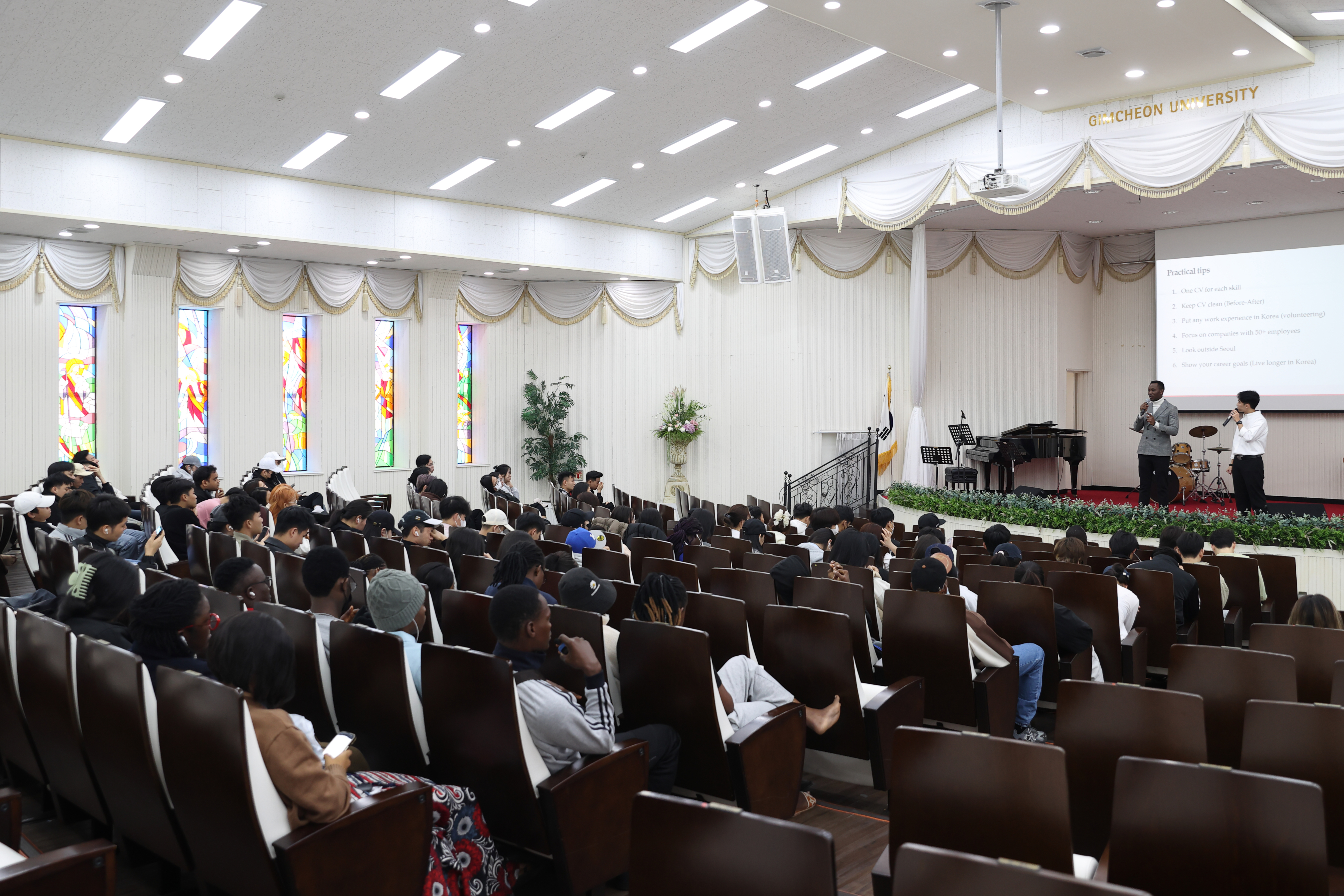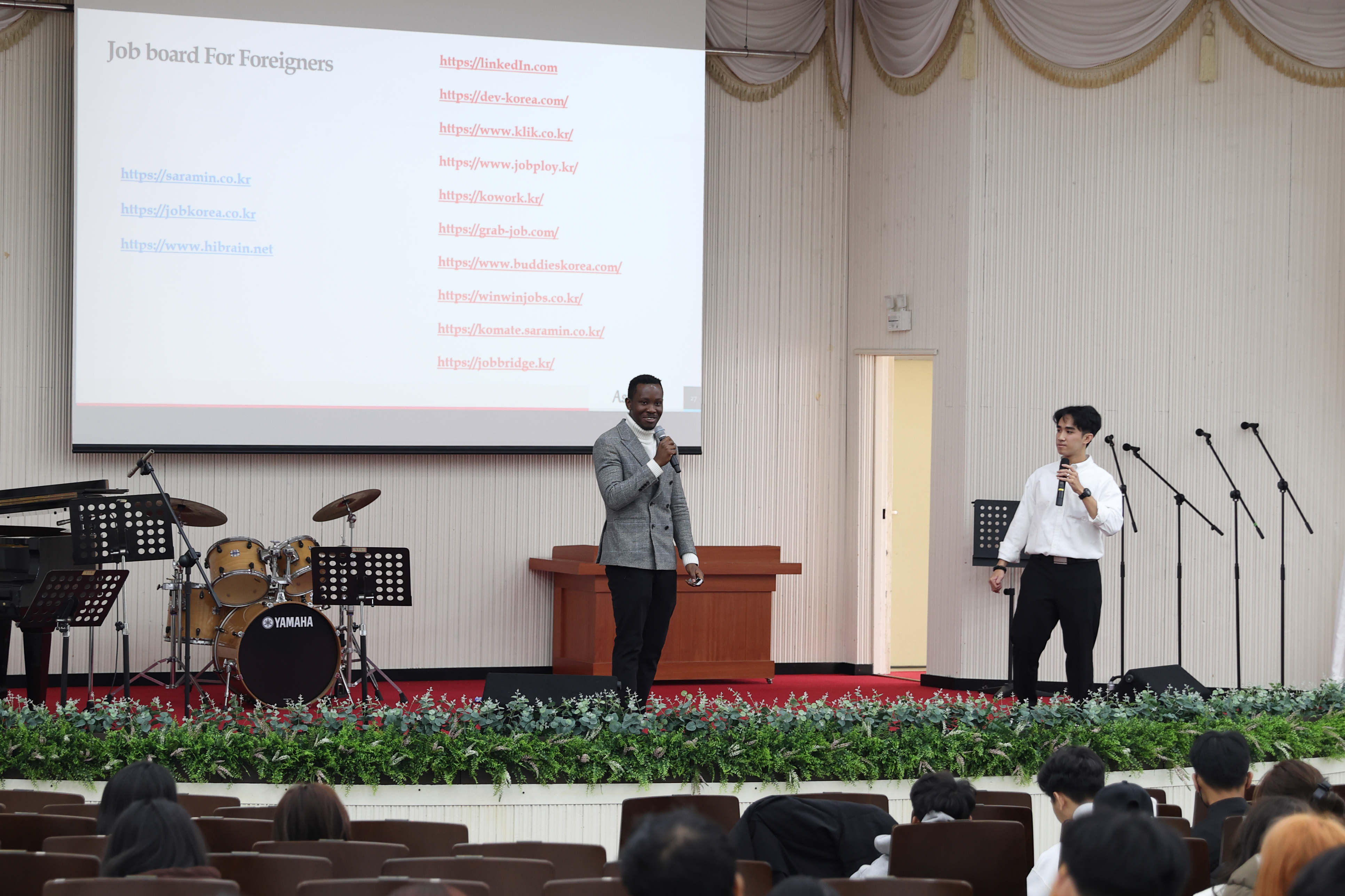 1부 강연은 베냉 출신의 외국인 취업 전문가이자 창업가인 Assist-me 대표 카지미르 아고수(Casimir Agossou)가 맡았다. 10년이 넘는 현장 경험을 바탕으로 유학생들의 진로 설계와 취업 준비에 실질적인 조언을 제공했다. “유학생들이 한국 사회에 잘 적응하고 성공적으로 취업을 준비하기 위해서는, 초기부터 명확한 계획을 세우고 자신의 강점을 파악해 전략적으로 접근하는 것이 중요하다”라고 강조했다.