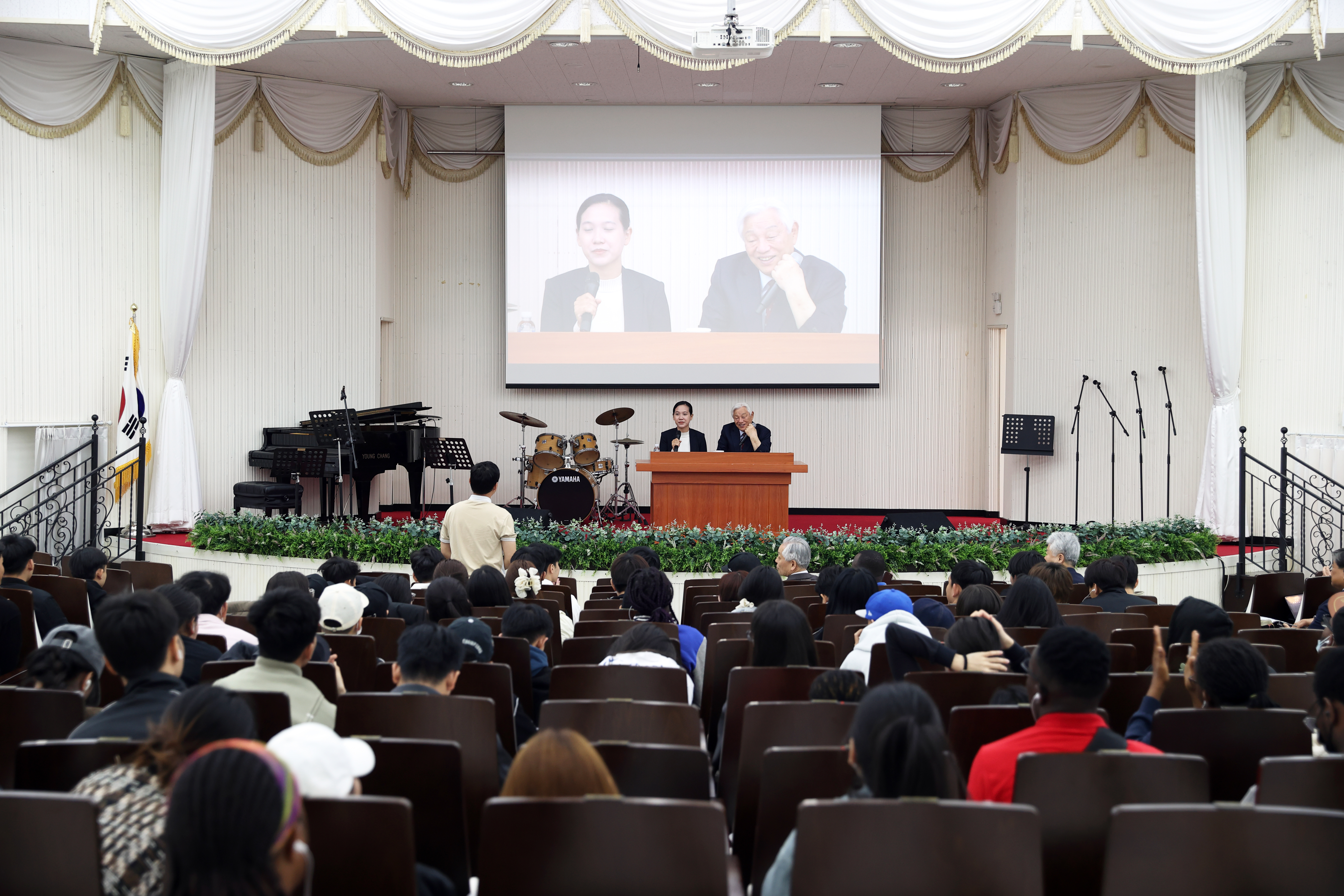 2부 강연에서는 김천대학교 박옥수 이사장이 연단에 올라 ‘마음의 세계’에 대해서 강연을 이어갔다. 박 이사장은 “물질적으로 눈에 띄는 발전을 이룬 현대 사회 속에서, 진정한 발전은 마음의 세계에서 비롯된다”라며, 이어 “세상에는 남에게 피해를 주는 사람도 있고, 유익을 주는 사람도 있다. 여러분은 어떤 사람이 되고 싶은가?”라는 질문을 던지며 유학생들과 자유롭게 소통하는 시간을 가졌다. 또한 “여러분이 한국어를 더 잘 배워 한국 사회에서 꿈을 이루고 오래 머물기를 바란다”라며 따뜻한 격려의 메시지를 전했다.