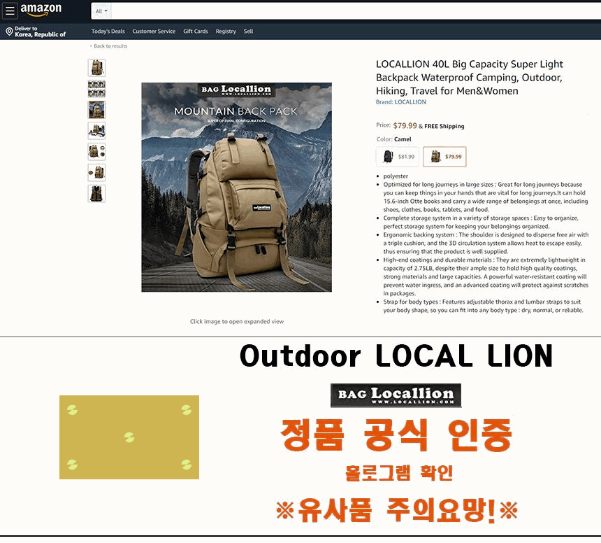 로컬라이온 국내 정식 수입품 배낭 판매합니다.