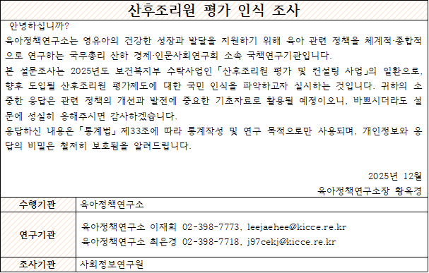 출산 계획이 있으신 여성분들 대상으로 '산후조리원 평가 인식조사'를 실시합니다.