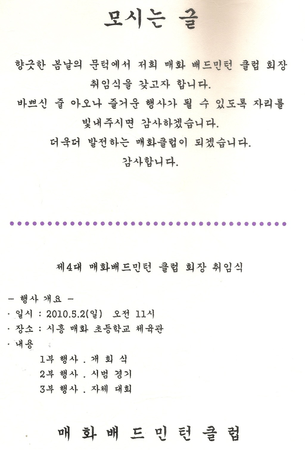 [스크랩] 매화클럽회장 취임식에 초대합니다. 작성자마음의향기|작성시간10.04.22|조회수39 목록 댓글 0 글자크기 작게가 글자크기 크게가 모시는_글.hwp 첨부파일첨부된 파일이 2개 있습니다. jpg 파일 스캔0002.jpg 다운로드 hwp 파일 모시는_글.hwp 다운로드 다음검색 스크랩 원문 : 매화한빛 배드민턴동호회 현재 게시글 추가 기능 열기 북마크 공유하기 신고 센터로 신고 댓글 댓글 0 댓글쓰기 답글쓰기 댓글 리스트