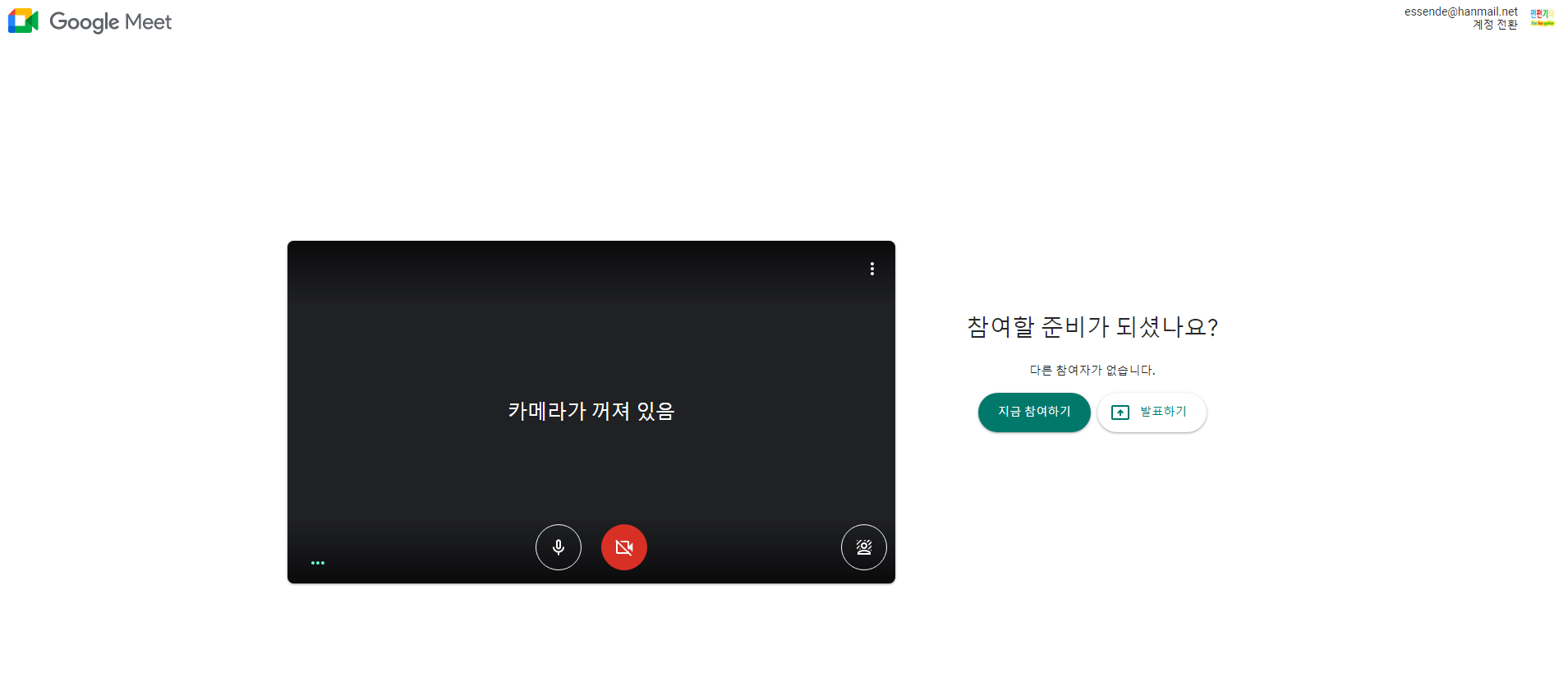 4. 참여하기 구글 미트에 접속한 뒤 초록색 "지금 참여하기" 버튼을 누르고 입장하고자하는 의견을 운영자에게 보냅니다.