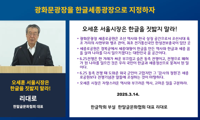 이어서 “오세훈 서울시장은 한글을 짓밟지 말라.”는 주제 발표를 한 한글학회 부설 한말글문화협회 리대로 대표는 “일찍이 우리는 경복궁 앞길 이름을 ‘세종로’라고 짓고 세종문화회관과 세종로공원도 만들고 세종로공원에 세종대왕이 만든 한글 역사와 한글정보통신 기념물을 만들었다. 이곳은 한글을 빛내어 나라를 일으키자는 온 겨레의 뜻과 꿈이 담은 곳이고 광화문광장에 세종대왕동상도 세우고 세종정신을 살리고 빛내자고 했다. 이 성스러운 곳에 슬프고 부끄러운 6.25동족 전쟁 때 외국군 도움을 받은 기념물을 크게 설치하는 것은 잘못된 것이다. 그 전쟁 기념물은 용산 전쟁기념관 앞들에 설치하는 것이 마땅하다. 세종로공원의 역사와 국민의 꿈을 짓밟고 나라 앞날을 어둡게 만드는 일이다.”라며 오세훈 서울시장이 대권욕에 눈이 가려 나라 망칠 잘못된 행정을 펴고 있다고 따졌다.