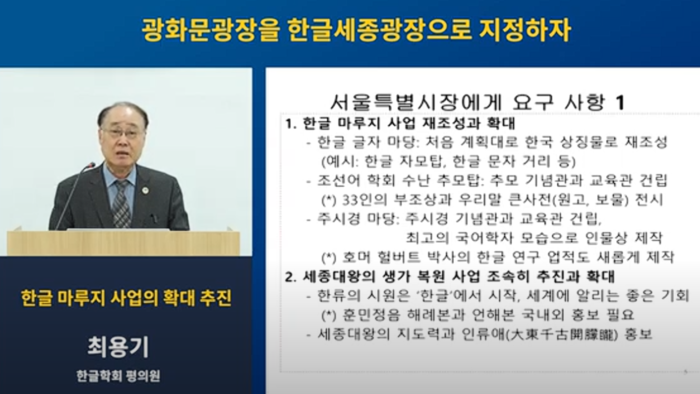 이어서 토론한 전 국립국어원 최용기 국어진흥부장은 “국립국원어원에 근무할 때에 한글마루지사업과 한글글자마당 조성하는 일에 참여했다. 그런데 그 글자마당을 어렵게 만들고 몇 해도 안 되었는데 더 잘 보존하고 개선할 생각은 안하고 엉뚱하게 6.25동족전쟁 기념물을 만들겠다니 어처구니가 없다. 한글이 태어나고 자란 경복궁 일대를 한글 역사유적지로 조성하는 한글마루지사업부터 제대로 추진하고 한글을 만든 세종대왕 생가복원과 주시경 선생 기념관을 짓는 것이 서울시가 힘써야 할 일이다.”라며 서울시에 요구사항을 발표했다.