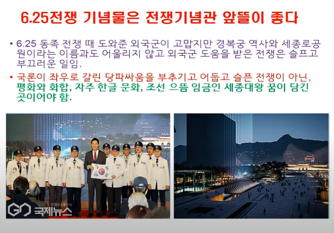 오늘날 한글은 한류 뿌리로서 세계인들이 칭찬하고 배우려고 몰려들고 있다. 이럴 때 정부와 서울시는 한글과 세종대왕을 더 내세우고 빛내야 할 터인데 오히려 짓밟고 있다. 그런데 요즘 탄핵정국에 가려서 서울시가 한글과 세종정신이 서린 광화문광장을 파괴하고 슬픈 전쟁기념물을 설치하는 것이 얼마나 잘못된 것인지 알지 못하고 있어 안타깝고 답답하다. 빨리 탄핵정국이 풀려서 나라를 빛내고 국민 삶을 안정되게 만들 일들을 할 수 있기 바라고 빈다. 그리고 많은 국민이 이번 토론 동영상을 보고 이 문제 심각성을 깨닫고 도와주면 좋겠다.