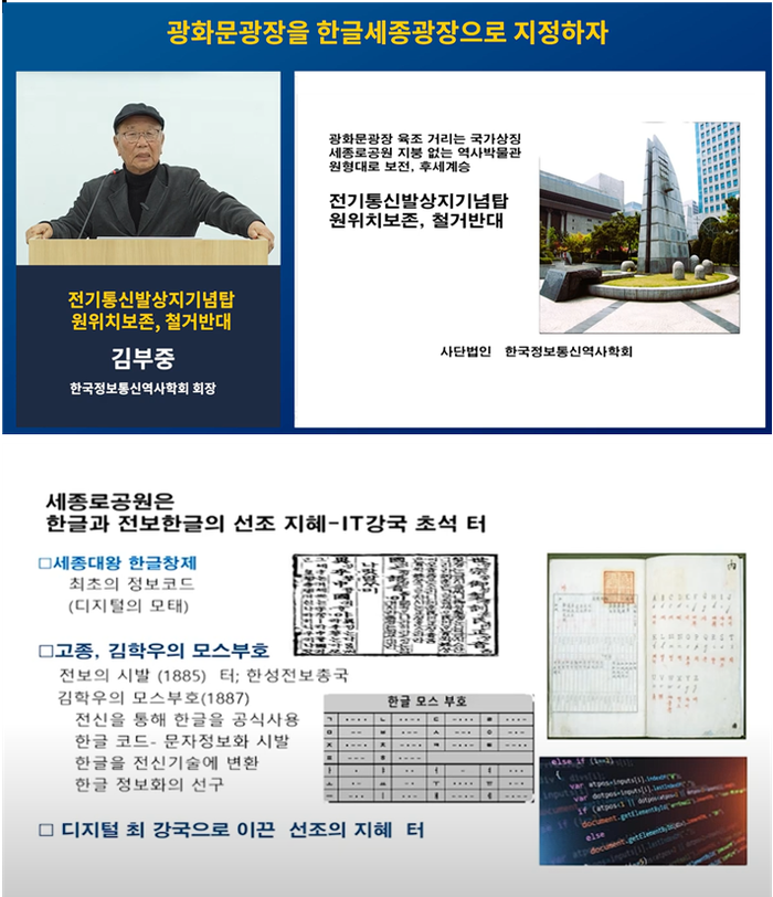 두 번째 주제발표를 한 김부중 정보통신역사학회 회장은 “세종로공원은 고종 때 우리나라 최초 전보통신 기구인 한성전보통신총국이 있던 곳으로서 전기통신발상지기념탑이 있다. 이곳은 세종이 만든 한글로 모스 부호를 만들어 과학정보통신을 시작해 오늘날 우리나나라가 한글정보통신 강국으로 이끈 뜻깊은 역사유적지다. 그런데 서울시는 이곳을 지저분한 사장바닥처럼 만들더니 그것도 모자라 이제 큰 카페를 만들고 6.25전쟁 때 참전한 외국군을 기리는 추모조형물 22개를 크게 만들겠다고 한다. 세종로공원 역사와도 어울리지 않고 민족 자긍심을 짓밟는 일이다. 우리 학회는 강력하게 반대한다. 만약에 서울시가 이 일을 강행하면 국민과 함께 반대투쟁을 할 것이다.”라고 밝혔다.