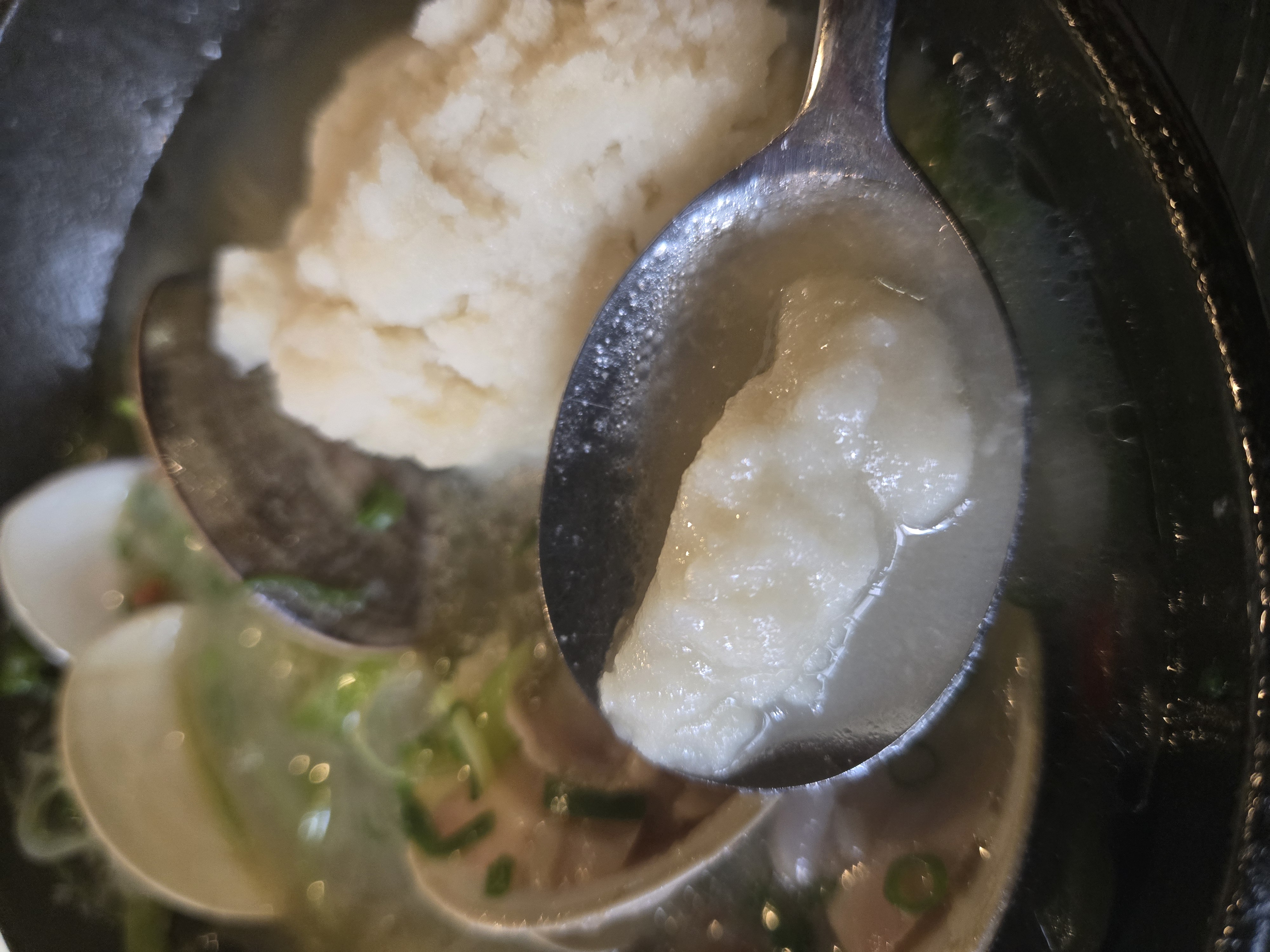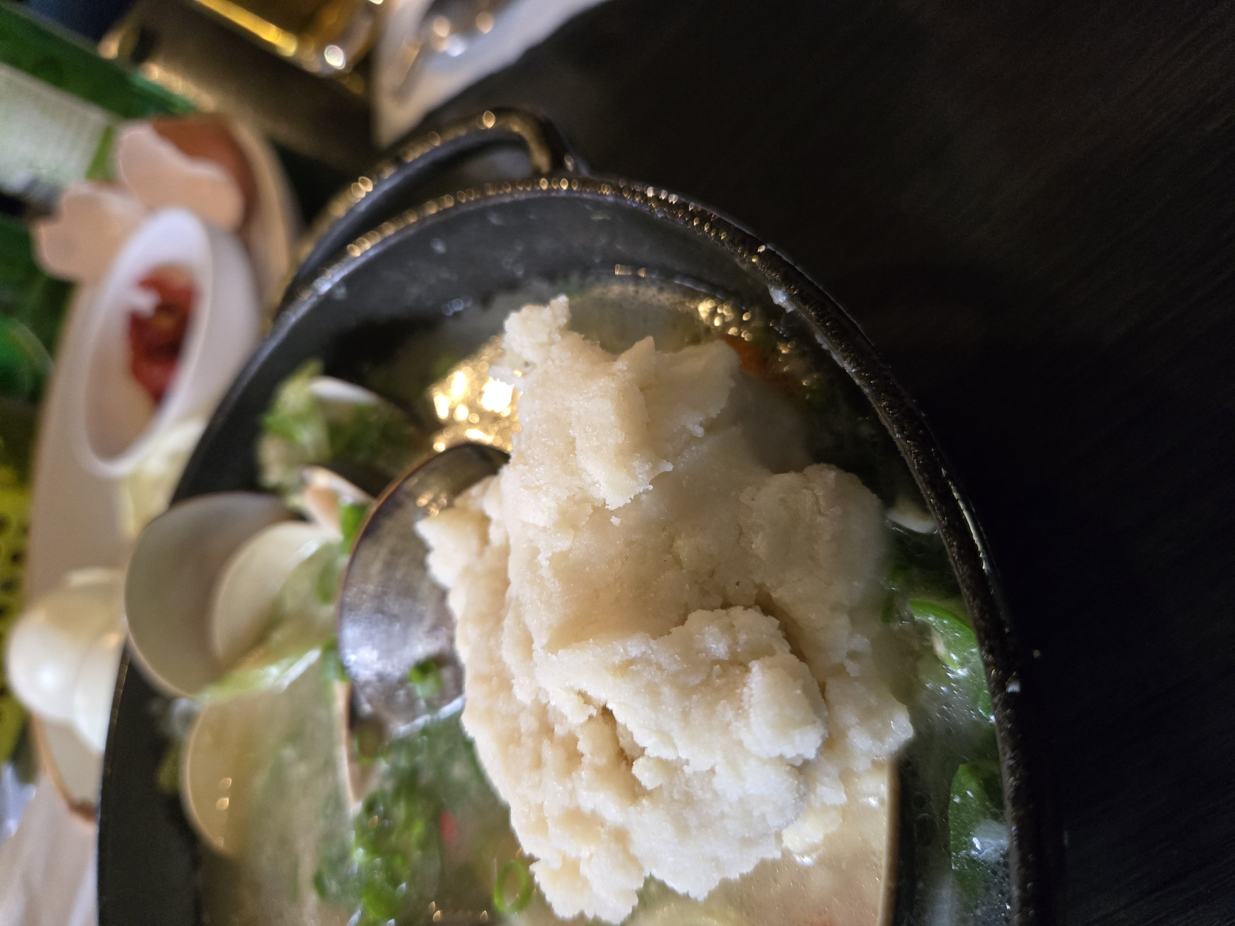 삶은 감자를 모짜렐라 치즈로 추정되는 것을 넣고 으깨 한 덩이를 국물에 넣어준것.