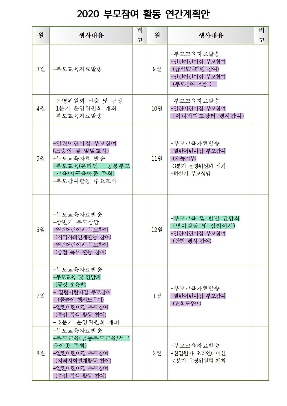 2020 부모참여활동 연간 계획안 작성자검단어린이집|작성시간20.05.25|조회수1,714 목록 댓글 0 글자크기 작게가 글자크기 크게가 열린어린이집 부모참여활동 수요조사에 의거 연간 계획안을 올려 드립니다.열린 검단어린이집이 될 수 있도록 더욱 노력하겠습니다. 다음검색 현재 게시글 추가 기능 열기 북마크 신고 센터로 신고 댓글 댓글 0 댓글쓰기 답글쓰기 댓글 리스트
