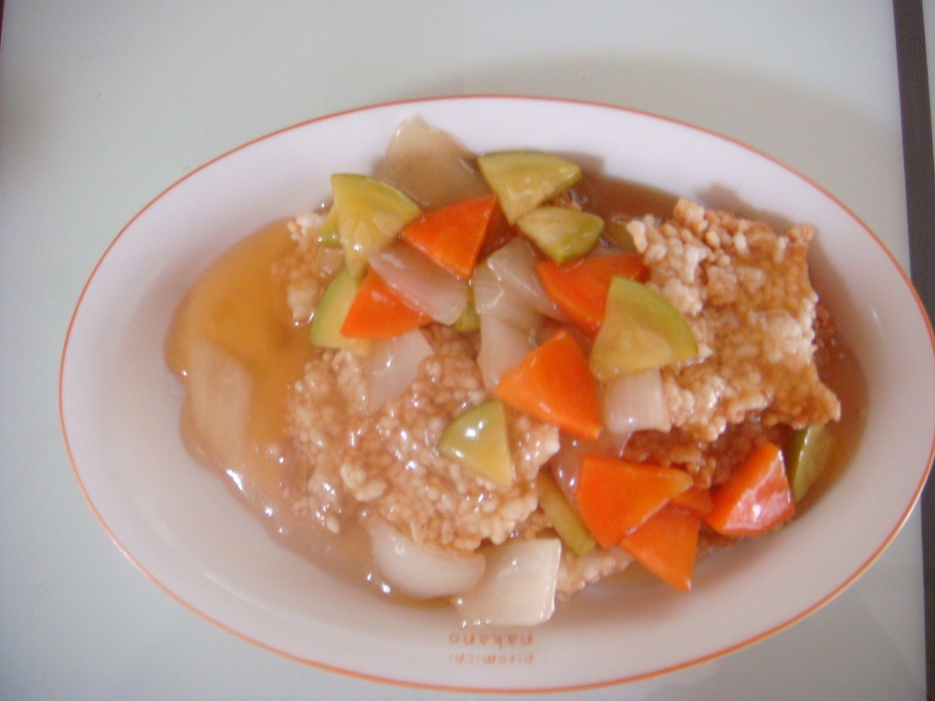 3.물을 한컵정도 넣고 간장2큰술,설탕3큰술 4. 그릇에 누룽지를 담고 소스를 얹어서 맛있게 먹는다.