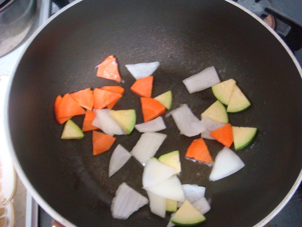 1. 남은밥(한공기정도)으로 후라이팬에 두툽하게 2. 냉장고 안에 있는채소를 썰어서 기름조금 넣고 살짝 볶는다.