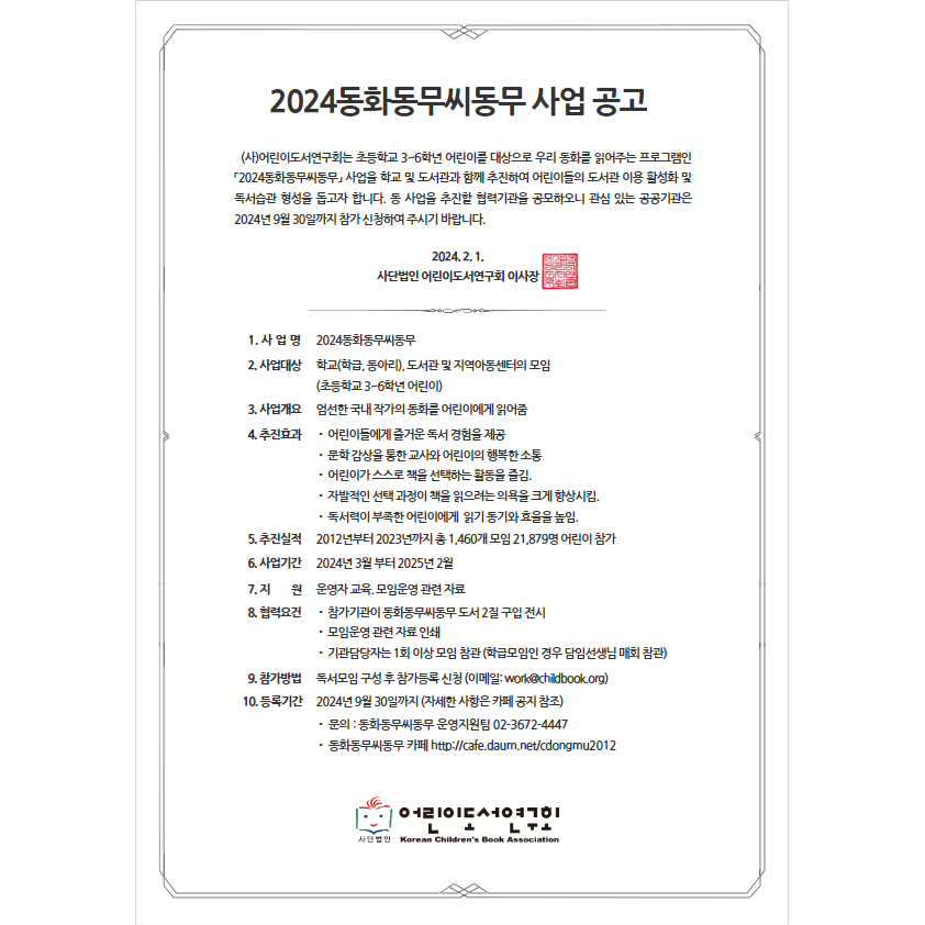 [스크랩] [공문]2024 동화동무씨동무 사업 공고 작성자21기 이지형|작성시간24.03.01|조회수18 목록 댓글 0 글자크기 작게가 글자크기 크게가 2024 동화동무씨동무 선정 도서2024동화동무씨동무 사업 공고 1.jpg338.61KB2024운영자료1 사업참가안내공문.hwp108.50KB2024운영자료13 참가등록신청서.hwp63.00KB 첨부파일첨부된 파일이 5개 있습니다. jpg 파일 2024동화동무씨동무 사업 공고 2.jpg 다운로드 hwp 파일 2024운영자료13 참가등록신청서.hwp 다운로드 hwp 파일 2024운영자료1 사업참가안내공문.hwp 다운로드 jpg 파일 2024동화동무씨동무 사업 공고 1.jpg 다운로드 jpg 파일 2024동화동무씨동무 사업 공고 1.jpg 다운로드 다음검색 스크랩 원문 : 동화동무씨동무 현재 게시글 추가 기능 열기 북마크 신고 센터로 신고 댓글 댓글 0 댓글쓰기 답글쓰기 댓글 리스트