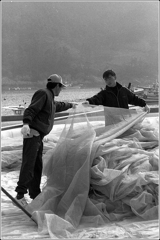 그믈을 손질하고 수선하고 미끼를 걸고 청소를 하고....새벽 두 세시에 바다에 나가 아침에 판장에서 고기를 팔고 남자들은 대부분 집에 들어가 모자란 잠을 보충하지만, 여자들은 그런 일 때문에 낮에 겨우 토막잠을 자기가 대부분이다.