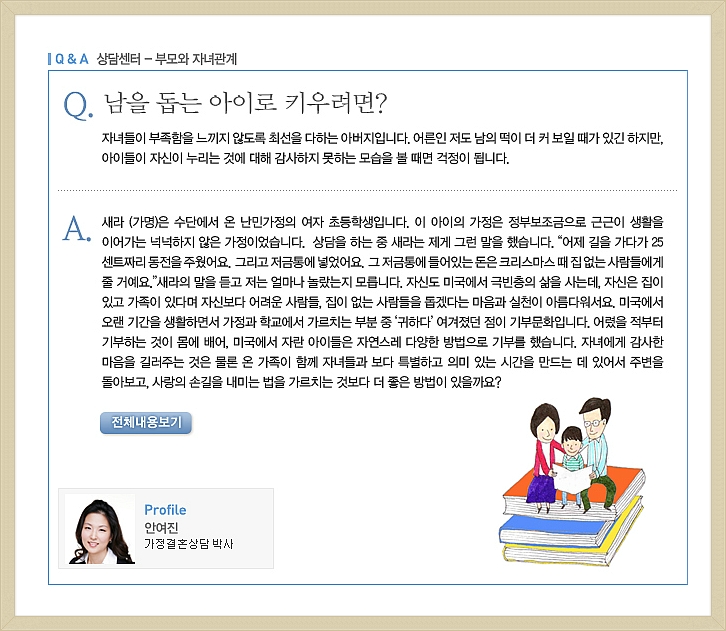 남을 돕는 아이로 키우려면? 작성자에스라|작성시간11.06.28|조회수19 목록 댓글 1 글자크기 작게가 글자크기 크게가 다음검색 현재 게시글 추가 기능 열기 북마크 공유하기 신고 센터로 신고 댓글 댓글 1 댓글쓰기 답글쓰기 댓글 리스트 작성자에스라 작성자 본인 여부 작성자 | 작성시간 11.06.28 자신밖에 모르는 한국사회, "나 만 아니면 돼" 라는 인식으로 가득차 있는 우리의 주변을 봅니다. 나 또한 예외는 아닙니다.이웃을 향한 발걸음이 저와 카페가족모두에게 같이 하길 기도합니다. 댓글 전체보기