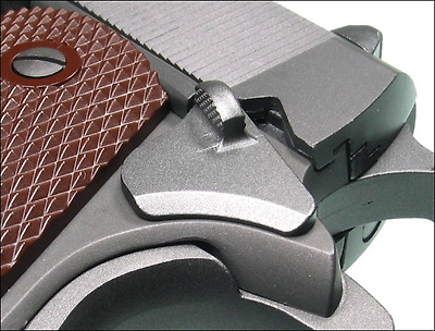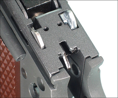 그동안 WA콜트에 불만이셨던 분들을 놀라 자빠지게 할 부분이 바로 이 부분이다. 구형(좌측)과 비교해 볼 때 파이어링 핀 플레이트의 위치가 해머 쪽으로 바싹 다가섰다. 또한 리어 사이트의 형상도 좀더 실총에 근접한 형태로 변형되었는데(높이가 낮아졌다) 이는 기존 제품의 '설계미스'가 아니라 성능을 위해 디테일을 포기한 예라 하겠다. 일반적으로 디테일을 살리기 위해 구조에 제약을 두거나, 그 반대인 경우가 대부분이나 이번 신형 콜트는 디테일을 살리면서 내부 메커니즘이 오히려 더 좋아진, 보기 드믄 경우가 되었다.