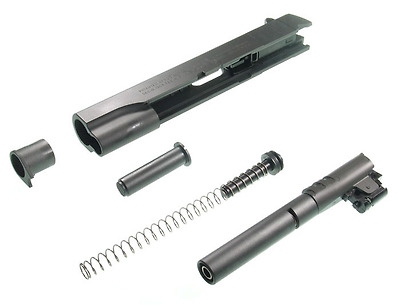 실린더의 분해. 구형모델은 리어 사이트와 연결된 나사를 이용해서 실린더 뭉치를 고정했지만 신형은 별도의 나사 없이 끼워 맞추는 식으로 실린더 블록을 장착하여 사용하고 있다. 분해에 주의를 해야 한다. 슬라이드 좌우를 살짝 벌려서 들어 내도록 한다.