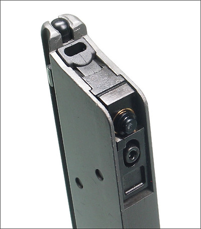 일명 GCS(개스 컨트롤 시스템)라 불리우는 내부 유니트이다. 플로팅 밸브와 실린더 마개 사이에 요상한 구조물이 보이는데 바로 GCS의 핵심에 해당하는 부품이다. 이놈은 유입되는 가스압에 관계 없이 일정한 손맛을 유지시키는 역할을 한다(탄속을 일정하게 유지시켜 주지는 못한다). 자세한 해설은 역시나 명총탐구 콜트 3편에서 다뤄 보기로 한다.