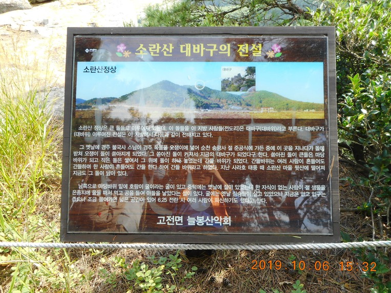 출발한지 10여분만에 운동기구 몇점과 "소란산 대바구의 전설" 안내판등이 설치되어 있고, 멋진 암봉이