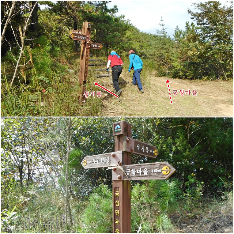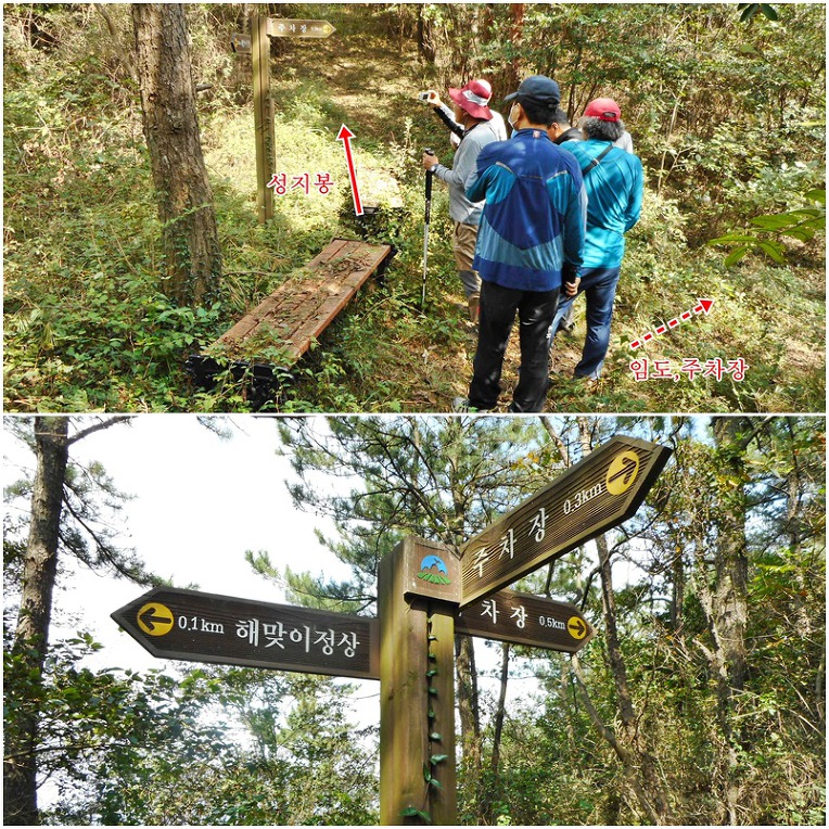 8분여후 이정목이 서있는 좌 성지봉으로 오르는 갈림길이 나오는데, 임도를 버리고 좌측 산길을 따라 오르면~~~