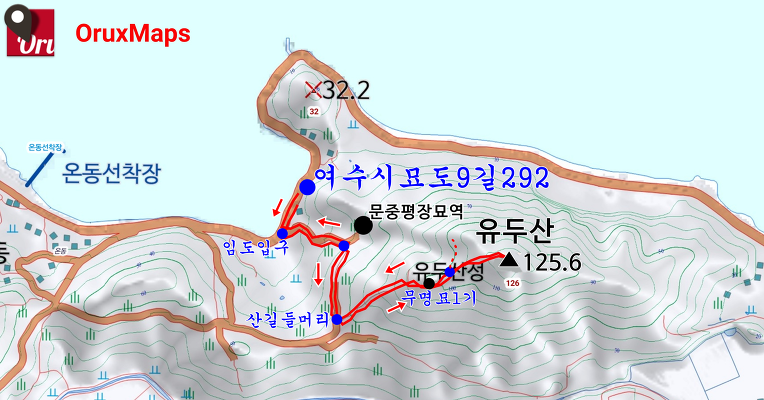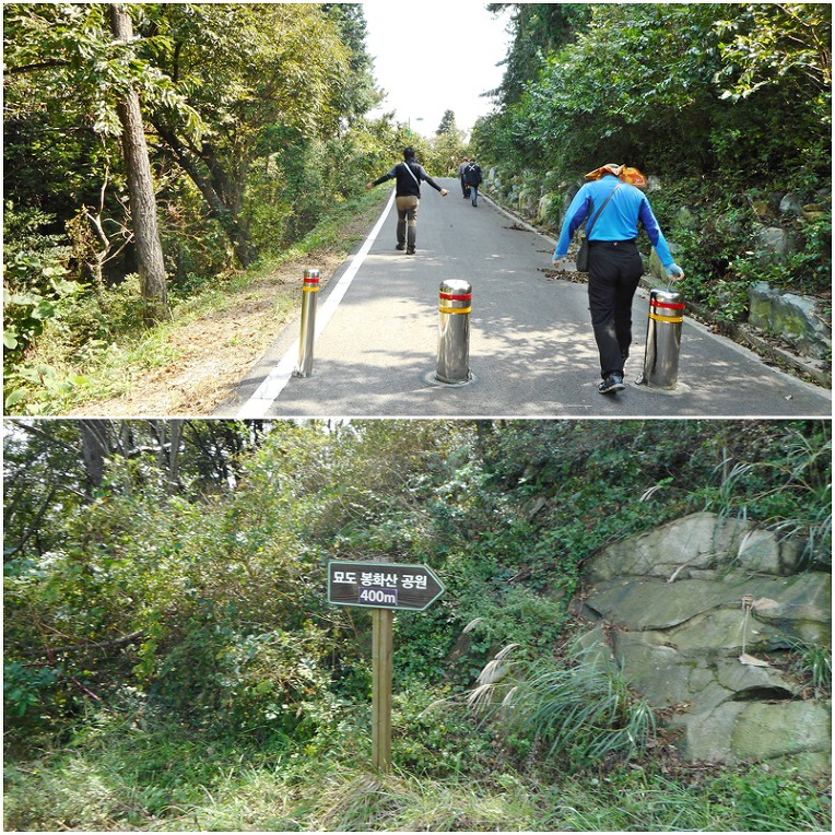 운행해왔던 '묘도9길'을 따라 100m정도 되돌아 나가면 나오는, 좌측 포장 임도를 따라 오르며 유두산 산행에